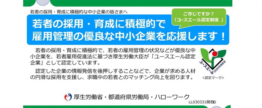 こんにちは!今日は厚生労働省さんが若年者雇用対策として施行されている「ユースエール認定制度」のご紹介です。