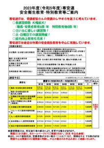 こんにちは!今日は「大阪建設専門業安全協力会連合会(専安連)」さんが実施されている「令和5年度.専安連 安全衛生教育・特別教育」のご紹介です。今回のご案内は令和5年4月から令和6年3月迄の講習になりますので、会社の行事等に合わせて社員の方の1年間の教育システムに組み込んで欲しいと思います。