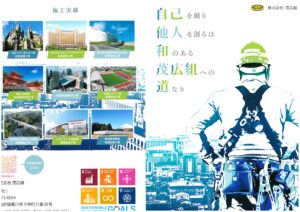 ㈱茂広組さんのポケットホルダーファイルは、長い歴史の中で建設専門工事業だけでなく、運輸業やアグリ事業等の様々な分野にも会社の事業を拡げ成功されていることを感じてもらえるように作成させて頂きました。歴史がありながら常に新しい事にもチャレンジする会社さんなので、その辺りをポケットホルダーファイルを通して感じてもらえると嬉しいなぁと思います。今回のポケットホルダーファイルもデザインを用紙いっぱいに作成してますので、下記の添付写真では文字が少し切れていたりしますが、現物はちゃんとできていますので機会がありましたら㈱茂広組さんで見てもらえると嬉しいです。また、とてもすてきな企業紹介パワーポイントデーターも作られてますので、関心のある方は本社事務所までお問い合わせくださいね!