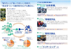 「つなぐ化」事業とは厚生労働省さんの委託事業で正式名は「令和5年度 建設業若年者理解・定着促進事業(「つなぐ化」事業)」と言います。建設業界の未来をつくっていく担い手を育てるために、学生さんや先生方、保護者の方の「知りたい」と、建設事業者の「知ってほしい」を結ぶさまざまな機会を創出することで、若年者の建設業への理解を深め、建設業界への入職促進と職場定着を図る事業です。 建設業の仕事の内容や醍醐味などを相互理解するまたとない機会を、キャリア教育の1つとして活用することができます。