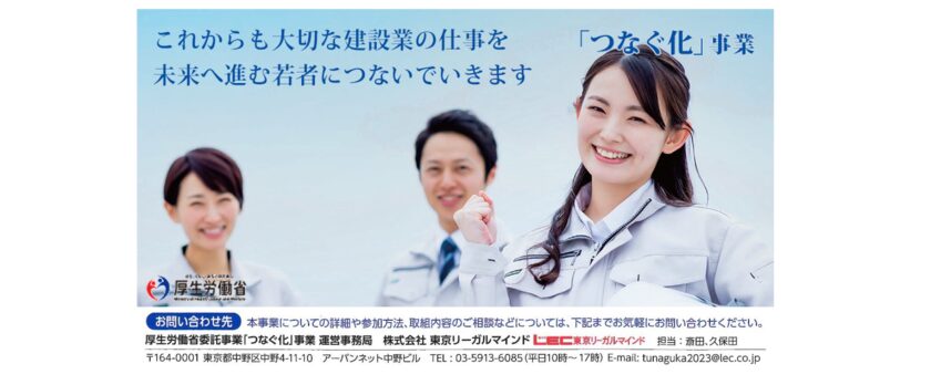 「つなぐ化」事業とは厚生労働省さんの委託事業で正式名は「令和5年度 建設業若年者理解・定着促進事業(「つなぐ化」事業)」と言います。建設業界の未来をつくっていく担い手を育てるために、学生さんや先生方、保護者の方の「知りたい」と、建設事業者の「知ってほしい」を結ぶさまざまな機会を創出することで、若年者の建設業への理解を深め、建設業界への入職促進と職場定着を図る事業です。 建設業の仕事の内容や醍醐味などを相互理解するまたとない機会を、キャリア教育の1つとして活用することができます。