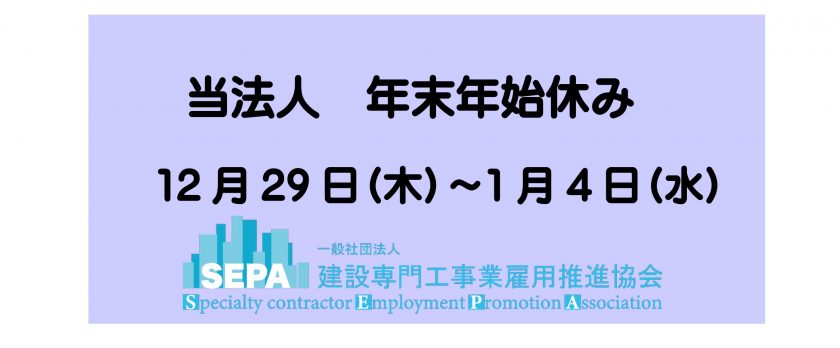 当法人では年末年始のお休みとして、12月29日(木)から1月4日(水)までをお休みとさせて頂きます。