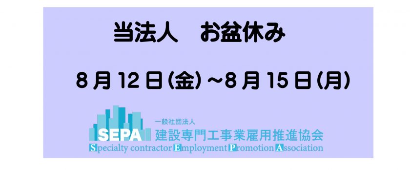 当法人ではお盆休みとして8月12日(金)から8月15日(月)までお休みさせて頂きます。