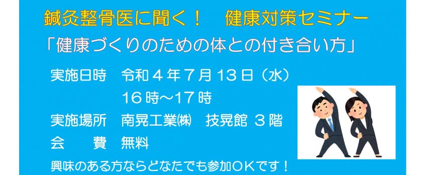 鍼灸整骨医に聞く! 健康対策セミナー」として下記の通りに実施させて頂きます!
