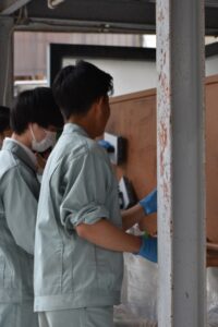 先生と当法人役員・事務局とで、学生さん達ができるだけ喜んでくれて、更に建設専門工事業の仕事に関心を持ってもらえるかと話し合って今回の施工体験学習の実施になりました。時間も4時限授業分頂き、学生さん、先生方、スタッフ一丸となって取り組めたので、建設専門工事業の仕事への理解を深めるだけでなく、学生さんとスタッフとの仲が深まり就職やお仕事についての本音のお話もでき、とても充実した事業になったと実感しています。次回は10/26に同校2年生18名も同じ内容で事業を実施することになっています。今回の残りの箇所をと考えていたのですが、2年生には難しい作業になりそうなので別の職種を体験してもらおうと考えています。10月まで時間があるので、じっくり先生方と一緒に構想を練り、生徒さん達の思い出にも残る事業を展開したいと思います。