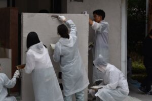 当日は当法人HP5月23日記事でご説明した通りのスケジュールで実施しました。少し建物が小さいので時間が余るかもと心配していたのですが、生徒さん達は後々まで自分たちの施工した証が残るという事で丁寧に作業してくれて、スケジュール通りに終了しました。
