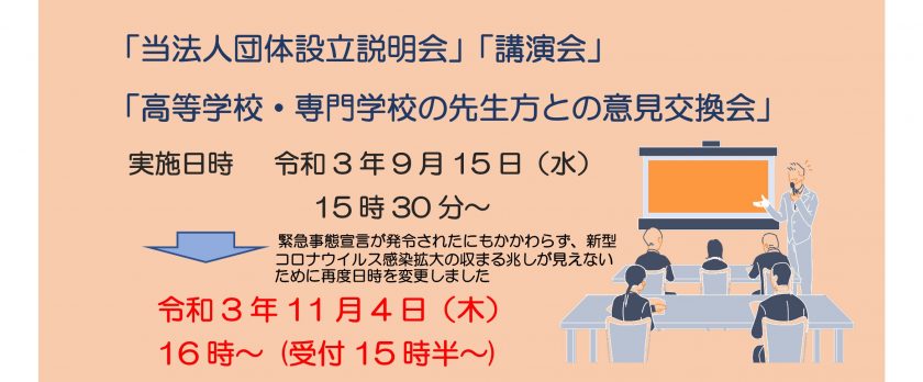 ご出席の予定をしてくださっていた方には本当に申し訳ないのですが、9月15日に実施予定だった「当法人設立説明会」「講演会」「先生方との意見交換会」を11月4日(木)に変更しました。日にちの変更に伴い、ご参加頂ける予定の先生方のご意見を反映し9月15日より更に30分遅く開始することにしました。詳細は下記の通りになります。なお、このまま10月になっても新型コロナウィルス感染症が猛威を振るっていた場合は日程変更・中止を再検討し、再度皆様にご連絡させて頂きますのでご了承の程よろしくお願いします。