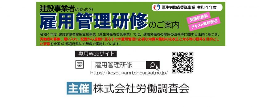 詳細を知りたい方や専用Webサイトでお申込されたい方は、「建設事業者のための雇用管理研修」の文字をクリックしてくださいね!㈱労働調査会さんHPの講習ページまでとびます。