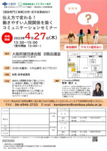 今回のセミナーは、建設専門工事業の団体である「(一社)大阪府建団連」さんとコラボとなり、建設業に特化した内容のセミナーを開催されることになりました。同じ日に女性・若手従業員向け「伝え方で変わる!働きやすい人間関係を築くコミュニケーションセミナー」も実施されます。どちらのセミナーも会場でのみ実施されるセミナーになりますが、質疑応答や「OSAKAしごとフィールド」さんの事業の説明等の時間をつくってくれているので、是非ご参加して欲しいセミナーです。詳しくはセミナーのご案内を添付していますのでご覧くださいね!