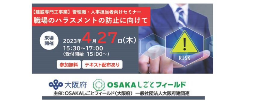 こんにちは!今日は「OSAKAしごとフィールド」さんと「(一社)大阪府建団連」さんが実施される管理職・人事担当者向けセミナー「職場のハラスメントの防止に向けて」のご紹介です。