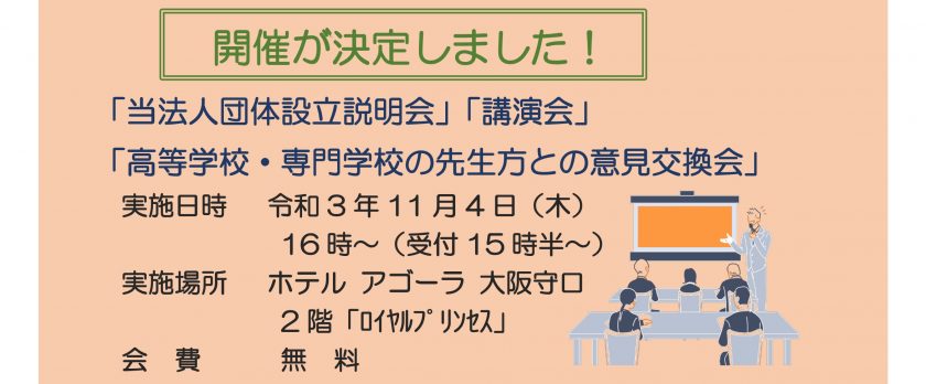 こんにちは!何度も日時変更のお知らせてさせ頂いていた当法人事業「当法人団体設立説明会」「講演会」「先生方との意見交換会」の開催が決定しました!新型コロナウイルス感染拡大の収まりの兆しがやっと見えてきて本当に一安心です。
