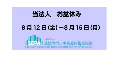 こんにちは!当法人ではお盆休みとして8月12日(金)から8月15日(月)までお休みさせて頂きます。御用の…