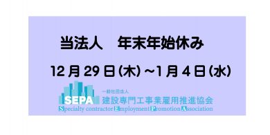 こんにちは!当法人では年末年始のお休みとして、12月29日(木)から1月4日(水)までをお休みとさせて頂きます。…