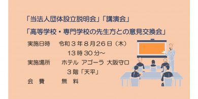 こんにちは!当法人では「当法人団体設立説明会」「講演会」「先生方との意見交換会」を8月26日(木)に「ホテル アゴーラ …