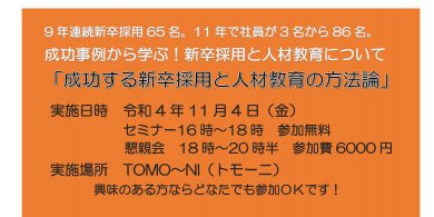 こんにちは!今日は当法人事業・雇用促進セミナーのご案内です。今回は、「9年連続新卒採用65名。11年で社員が3名から86…