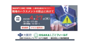 こんにちは!今日は「OSAKAしごとフィールド」さんと「(一社)大阪府建団連」さんが実施される管理職・人事担当者向けセミ…